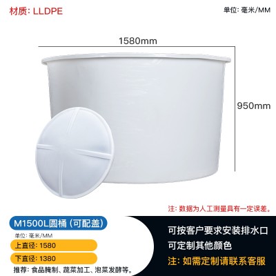 重庆涪陵1500L塑料圆桶 食品级腌制桶漂染桶 敞口PE圆桶——塑料圆桶的材料多采用聚乙烯等塑料滚塑而成,塑胶制品化工、农药、医药、食品、五金电子、机电等行业液体、固体物品的外包装。
