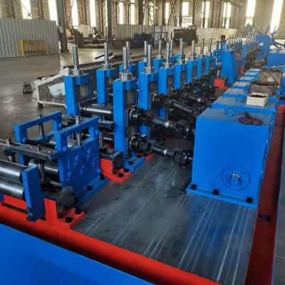 以带钢为原料,经开卷、成型、高频焊接、解决焊瘤、定径、校直、切断等一系列制管工序制造出圆钢管或各样式一行钢管的成套设备。采用辊式成型将带钢冷弯加工成圆坯,通过高频感应加热将焊缝挤压形成圆管,在经过定径加工生产出各样式标准规格的圆管、方矩形管。