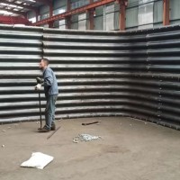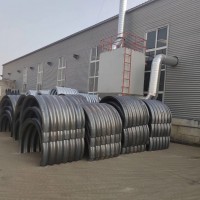 3 波纹管涵施工时,采用分段施工的方法,预先在原拱涵基底用角钢并排两根,长度根据涵长确定,作涵管推进时的滑轨,波纹涵管管径根据工程需要可有不同的规格,整装管管径为0.5m-2.5m,每节长度3.06米,采用内(外)法兰螺栓连接,拼装管管径为3m-8m,板与板搭接高强螺栓紧固。