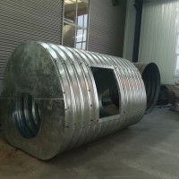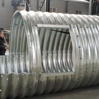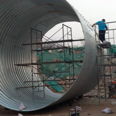 3 波纹管涵施工时,采用分段施工的方法,预先在原拱涵基底用角钢并排两根,长度根据涵长确定,作涵管推进时的滑轨,波纹涵管管径根据工程需要可有不同的规格,整装管管径为0.5m-2.5m,每节长度3.06米,采用内(外)法兰螺栓连接,拼装管管径为3m-8m,板与板搭接高强螺栓紧固。