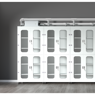 消毒净气(净化)器械柜药品柜配置:可以一柜一消毒净化器,也可多柜共用一台消毒净化器(通过柜顶管道连接)。
