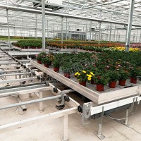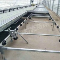 物流移动苗床在种植区内部是沿着圆管导轨移动的。苗床底部的滚轮由两条及一个底盘组成。苗床的底部有四组滚轮。苗床可以在导轨上移动。苗床平行的圆形钢管支撑。种植区被苗床移动线分割成若干区域,苗床放置在每个区域内。当有新的苗床被推送到导轨上的时候,将推动之前放置的苗床,苗床之间可以互相推动。种植区导轨由规格为48x2.5mm的热镀锌钢管连接在一起,由导轨支架支撑。导轨支架通过膨胀螺栓固定在混凝土地面上,导轨的高度可以上下调节。苗床的横向移动是由多组移动线轨道组成的。苗床传送线由多组移动线轨道连接。移动线轨道由铝合金边框、支腿、横梁和安装在边框侧面支撑苗床的滚轮组成。铝合金边框通过铝合金支腿固定在所需的位置,边框之间有铝合金横梁。苗床可以由一组轨道移动到另一组轨道。每组苗床移动轨道安装有两条压缩空气驱动的可升降导轨,当轨道升起以后,苗床可以沿升降轨道移动到种植区导轨上。通过气缸及机械结构将苗床抬起或者落下,使苗床可以在横向的移动线轨道和纵向的种植区导轨之间切换移动方向。