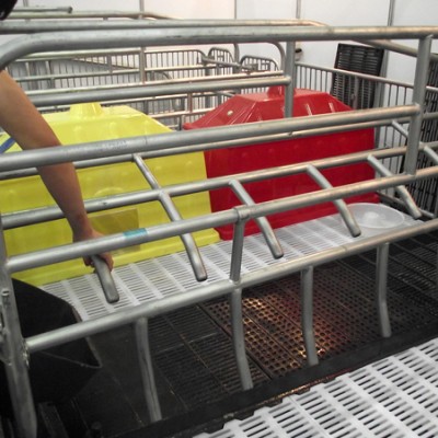 母猪产床,主体采用热浸锌管或喷漆管焊接,使其结构 合理,经济实惠,质量和寿命大幅提高,成为各大规模化养猪厂的 ,仔猪塑料地板,母猪球墨铸铁地板,扁钢大梁支撑。含母猪食槽,仔猪圆形补料槽,保温箱,电热板。