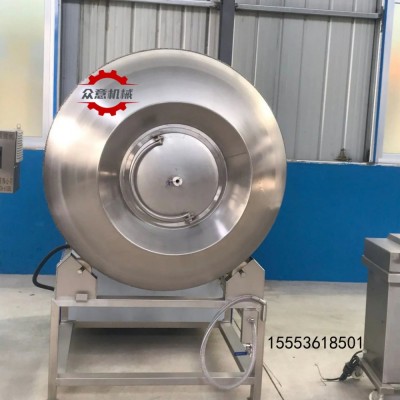 真空滚揉机也叫真空腌制机,主要是将加工的肉类,如牛肉,羊肉,鸡肉,鸭肉,鹅肉,猪肉,鱼肉及蔬菜,果品等,产品放在真空状态内,可提高调味品进入肉品的速度,并保持肉内的水分,通过筒体转动进行滚揉。筒体转动时,块状肉在真空状态下膨胀,纤维组织被拉开,在导叶片的作用下沿筒壁作向前→向后→向里→向前的回旋运动,互相挤压,同时沿筒壁切向翻滚、摔打。这样使肉体蛋白质分解成水溶性蛋白,易被人体吸收。(食品加工机械厂家Tel:155*5361-8501)