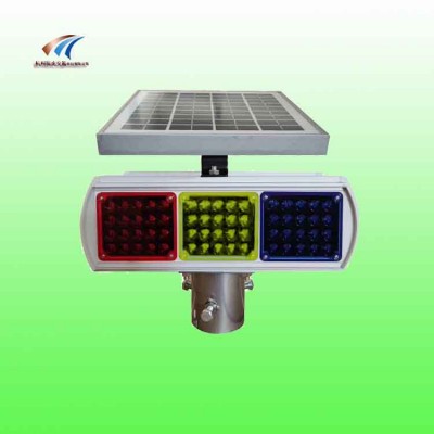太阳能三灯爆闪灯特点:外壳由经氧化处理的铝型材组合,表面塑料喷漆,外观精美,长时间使用并不会出现锈迹斑斑,闪灯采用密封结构组合式灯组,每组20个超亮LED,真空镀膜反光板,亮度高,警示效果好,聚碳酸酯灯罩,抗冲击,耐老化,整灯的密封密封效果好,有很好的防水性,并配有过充电过放电保护功能。