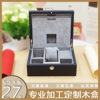 我们定做木盒包装盒中纤板包皮木盒,图片所示,是一款木制首饰收纳盒,胚体为9MM中纤板,外包特种纸,内灰色长毛绒布(如图所示)适用于各种首饰和手表收纳,整体高端,大气,上档次。表面烫印LOGO。RL铰连接,,配备金色按钮锁,尽显奢华