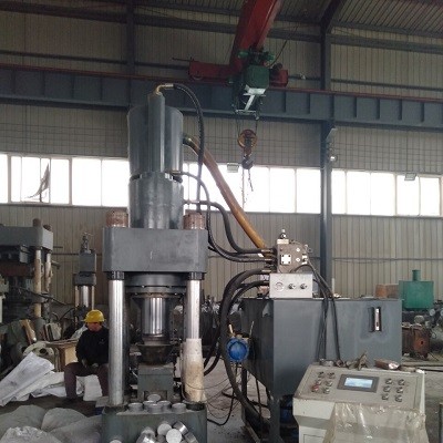 全自动铝屑压块机的结构特征:由上下横梁、液压缸总成、加料缸、模具、料斗、充液总成等组成。上下横梁由立柱和螺母联接,主液压缸前端用法兰联接在横梁底部,模具固定在下横梁上,模套固定在模具内,冲头直接联接在油缸活塞杆顶端,模套和冲头均可拆卸和更换。有一抽板缸位于主机下模具后面,抽板缸前位时与模套形成模腔底部,后位时底部形成空间,利于饼块落下,同时具有推饼出模具底部的功能。加料缸和加料斗组成自动加料架构,机器的加料由加料缸的往复动作完成。充液系统位于横梁侧面,以补充主油缸快速前进所需的油液。