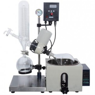 实验室旋蒸仪手动升降1L旋转蒸发仪工作原理:蒸发瓶恒速旋转,水浴锅恒温加热,在此条件下:物料在蒸发瓶内壁形成大面积均匀薄膜蒸发,在真空条件下可以提高蒸发效率(需连接真空装置),溶媒蒸汽经玻璃冷凝盘管时冷却成液体(需连接冷却装置),回收于收集瓶。产品使用需配套真空装置(循环水式、旋片式、隔膜式等真空泵),冷却循环装置组成系统装置。