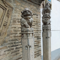 拴马桩一般竖于大门外两侧,与上马石配套使用。其结构分为桩首、桩颈、桩体、桩基四部分。桩首多采用圆雕,造型丰富;桩颈为承托部分,雕刻精美;桩体多为毛坯或简单雕凿;桩基则埋入地下。
