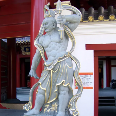 在形象上,石雕哼哈二将通常被雕刻成两位身材魁梧、肌肉发达的武将。他们的面容刚毅,眼神坚定,展现出一种不屈不挠的精神风貌。哼将的嘴唇紧闭,似乎正在用力哼气;而哈将则张口大笑,仿佛在发出豪迈的笑声。这种对比鲜明的面部表情,使得哼哈二将的形象更加生动有趣。