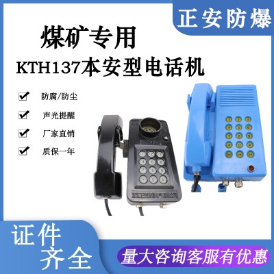 KTH137本安型数字电话机适用于具有、煤尘等性混合物气体的煤矿井下,做为采煤工作面掘进工作面、装载点、运输巷、变电所、水泵房,洗煤厂,井下,隧道,电厂,钢铁厂,铁路,公路,金属矿,化学厂,工厂装载点,运输巷,变电所,水泵房,石油,化工场,港口,码头,机场,厂用办公室,调度室等含有瓦斯()等场所的通讯工具,与煤矿总机联合使用,构成矿用生产调