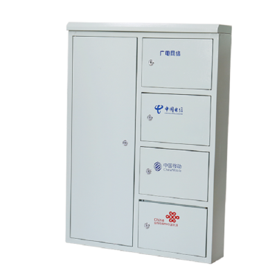 户外四网合一光纤分纤箱适合于光纤接入网中的铠装光缆与入户皮线光缆交接点使用。箱体采用壁挂或抱杆安装方式,适用于室内和室外两种场景使用;通过PLC型插片光分路器及快速连接器对外线铠装光缆与入户皮线光缆之间进行连接与调度。