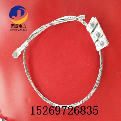 接地线夹主要作为OPGW 管理接地用,为短路电流提供通路。接地线线夹由一根接地线(通常选用柔韧的镀锡铜绞线或铝绞线)及一套铝合金并沟线夹(连接OPGW光缆与接地线)和一个端子(连接铁塔)组成。通常终端搭配一根,直线塔配一根,接续塔配两根