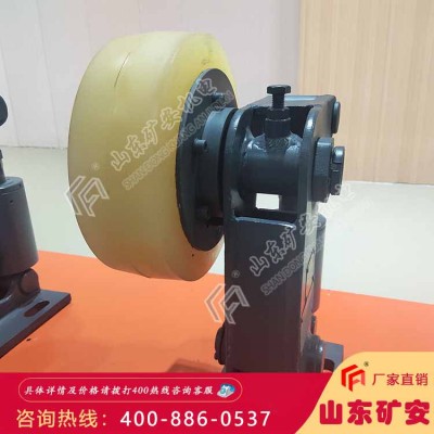 根据滚轮磨损情况,应对滚轮进行调整,方法是松开螺杆锁紧螺母,转动螺杆使滚轮靠向罐道,间隙0~2mm,调好后紧固锁紧螺母。
