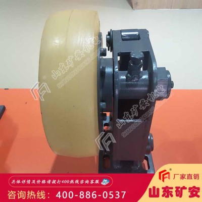 根据滚轮磨损情况,应对滚轮进行调整,方法是松开螺杆锁紧螺母,转动螺杆使滚轮靠向罐道,间隙0~2mm,调好后紧固锁紧螺母。