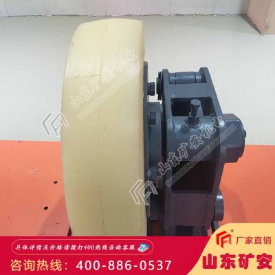 滚轮罐耳是组合钢罐道导向装置,滚轮罐耳主要由滚轮、支架、弹簧缓冲装置、底座等组成。弹簧缓冲装置由调节套、调节螺杆、螺母、碟簧轴、导向套、并帽、紧定螺钉、碟簧、平键、缸筒等组成。