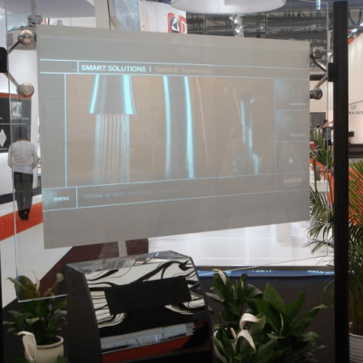 全息投影幕,又叫全息背投幕、透明背投幕,是采用了全息技术的新一代创新型背投屏幕,能提供空中动态显示,透明的显示效果允许观看者可以观看屏幕上图象的同时还可以看穿屏幕,外观看起来像一块透明玻璃,及具创新性。单片穿透式屏幕,内部具有精密的光学结构。具备高透光性、高亮度、高对比度的特点。具有同时呈现实景与影像的功能,这种全新的互动展示技术将装饰性和实用性融为一体,是一款时尚的展示工具。