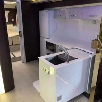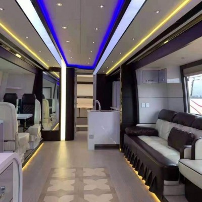 整个设计简约舒适、美观大方,内饰色彩的搭配均采用了人性化的设计。整车设计划分为:驾驶区、商务区、卫生间、厨房区域和休息室等五个区域组成。刚走进客厅可以看出整个装饰的豪华感,车上安装了航空座椅,多向滑动、旋转、按摩、加热、还有座椅呈包围形式对身体保护面更大。用餐区空间足够宽敞,厨房区域有高制冷可制冰的车载冰箱,首排座椅位置设有带独立液晶屏的VIP办公桌,配备独立电源。休息区我们可以看出空间十分的静谧,可以容纳十多个人的休息区也不会感到拥挤,车内暖和恬静,令人流连忘返。
