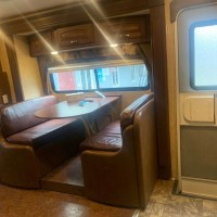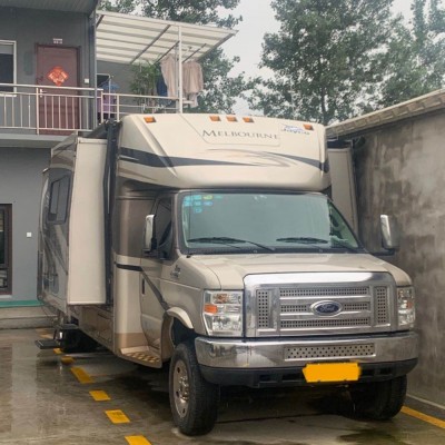 福特E450A型豪华房车从外观看上去是一个庞大的家伙,可以想象房车内部有多大的空间了。房车采用的是福特E450底盘改装而成,搭载的是6.8L-V10发动机,马力305Ps(227kw)、峰值扭矩452N·m、时速170km,百公里油耗26L,油箱容量208L,房车采用后轮驱动,采用前后独立悬架,整车舒适度非常高。小离地间隙20cm,通过性也比较好,车身尺寸为9.6x2.5x3.5米,体型非常大,车身重量为6591KG,轴距达6450mm,内部使用面积30㎡,堪比一般的家庭住房。别看它这么大,安全系数也是非常高的,前后液压盘式制动器、倒车影像 电动车窗、安全气囊、定速巡航、ABS与转向助力系统等安全配置,内部配置了烟雾报警器、气体检测器等,可以保障行驻车安全,还有钢板弹簧减震器增强稳定性。