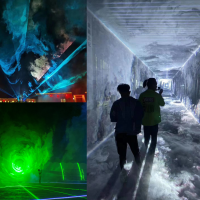 北极光,是出现于激光搭配烟雾的结合,呈现在上空的一种绚丽多彩的发光现象,激光也可以在一团烟雾中可出现一个如时光隧道般的幻觉世界,令游客如置梦中。隧道可打一个,也可打多层,也可套中套,花样多变,让游客感到不可思议!