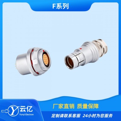 F系列微圆形高密度连接器为分瓣式推入拉出式结构,插合后具有自锁功能,内部采用半园定位片防止误 插,另有其行生T系列和C系列,分别有定位销定位片多 方定位系统,防止相同芯数上的错误插拔,同时还具备 盲插功能,使用起来方便快捷。 该系列连接器具有快速插拔、高密度、防水、小体积、盲插及寿命高等特点。特别适合于高密度安装、相对狭小的空间安装及使用旋转方式插合分离困难的场所。能应用于野外恶劣环境,防护等级1P68。 该连接器被广泛应用于军、民领域的电台设备、测试设备、音响设备、数据采集、工业控制、航空航天等场合的直流交流电路的电气连接。