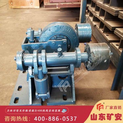 运转中由于滚轮的胶层被磨损,通过调节螺杆调节滚轮使滚轮前倾靠近罐道。调节螺杆一端为左旋螺纹另一端为右旋螺纹,分别拧入调节套和碟簧轴,调整时松开调节螺杆下边的螺母,逆时针转动调节螺杆,螺杆拧出,滚轮前倾靠近罐道,调好后紧固调节累杆下边的螺母。