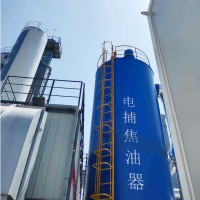 电捕焦油器采用圆筒体结构,内部为直立式管束状结构,在每个圆管中间悬挂一根放电级,管束壁为沉降级,下端设有储油槽。其工作原理为当发生炉煤气进入电捕焦油器后会通过强电场,由于电离使得煤气中大部分的粉尘以及焦油带负电,而管束壁为正极,所以粉尘以及煤焦油向管束壁移动并流至储油槽被收集起来。通常电捕焦油器的加直流电压为50-60kv,工作电流为200-300ma,煤气流速约为1.5m/s,煤气脱焦除尘效率在98%左右。