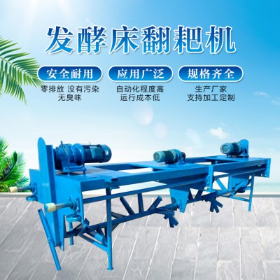 猪粪翻耙机,翻耙机结构特点:1、翻抛机采用地槽结构,具有操作简单、发酵周期短、发酵充分、污染小、扩广方便等特点。2、料层供氧穿透能力强,好氧发酵均匀,发酵池侧面配置固定式铜质滑触电缆,安全、可靠、耐用、维护方便。3、该机的创新点是充分利用地下空间的深池设计和远距离翻堆新工艺,利用有限的地面面积使有机废弃物无害化处理规模化成为。4、结构紧凑、工艺先进,利用部分有益微生物能促进畜禽粪便等有机废弃物快速腐熟的特点,采用独特的池式连续好氧发酵技术,使有机废弃物快速腐熟、去水、灭菌、除臭,达到无害化、资源化和减量化处理的目的。能源消耗低,产品质量稳定。5、智能化自动控制发酵物料的翻堆过程,在纵横向行走机构的作用下,使发酵物料在池内产生的翻堆位移,物料在池内有规律的作连续的渐进式后移,从而形成了一种连续的好氧发酵过程。