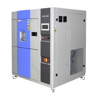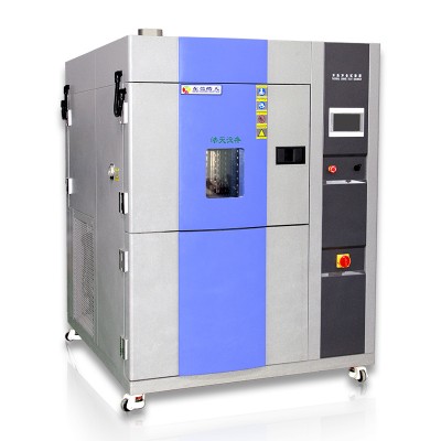 高低温冲击试验箱根据试验需求及测试标准分为三箱式和两箱式,区别在于试验方式和内部结构不同。三箱式分为蓄冷室,蓄热室和试验室,产品在测试时是放置在试验室。两箱式分为高温室和低温室,是通过电机带动提篮运动来实现高低温的切换,产品放在提篮里,是随提篮一起移动的。
