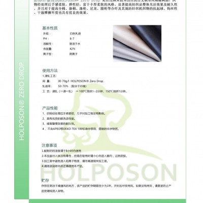 Zero Drop 是经过纳米技术改性的自交联型酸树脂,织物经处理后手感柔软,弹性好,富于丰厚柔软的风格。显著提高纺织品整体光洁效果及耐久性,并且对于提高全棉、涤棉、涤纶、尼龙、腈纶等合纤及其混纺针织机织物的抗起球、钩丝性、干湿摩擦牢度也具有优良的效果。