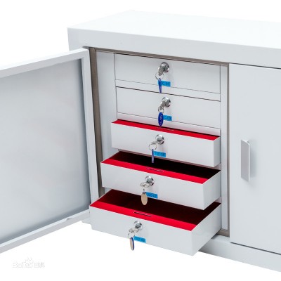 抽屉:抽屉选用 0.25mm 镀锡钢板,由模具冲压成型,保证抽屉形状大小一致。抽屉两侧设有拉出定位凸台,后面设有推进到位弹性补偿,保证抽屉锁上后位置准确一致。抽屉内采用绒布内衬装饰,美观大方、手感柔软舒适。