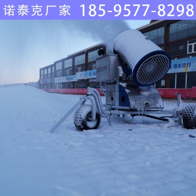 诺泰克人工造雪机造雪所用的材料是水,在零度以下,在低于百分之八十的环境湿度中通过高压空气将水流分割成微小的粒子喷入寒冷的空气中,来自高压水泵的水与空气压缩机的高压空气在双进口喷嘴处混合。利用自然蒸发和空气出喷嘴后的体积膨胀带走热量,而使雾滴凝固成冰晶,在下降过程中会遇冷凝结成雪。