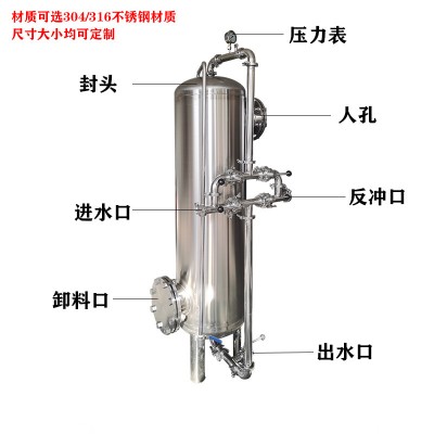 在压力下,把浊度较高的水通过厚度的粒状或非粒的石英砂过滤的截留除去水中的悬浮物、有机物、胶质颗粒、微生物、嗅味等,达到降低水浊度、净化水质的一种过滤设备。