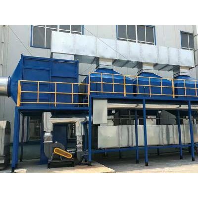 催化燃烧阶段:废气经风机送入到催化燃烧室前的换热器,然后进入催化燃烧室中的预热器,在加热器的作用下,使废气温度提高到250-300℃左右,再进入催化燃烧床,废气在催化剂的作用下无焰燃烧,被分解为和水,进行排放。欢迎新老客户来电咨询 焊接喷涂车间废气净化催化燃烧设计方案报价