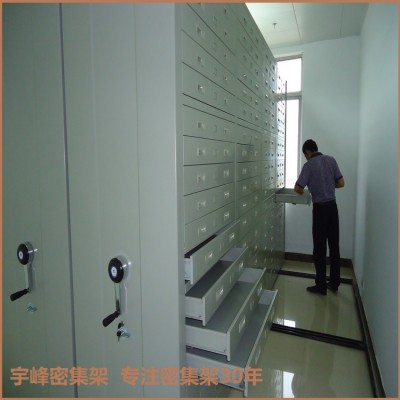 6、  架体之间的接触面均有缓冲和磁性密封胶条。顶部有防尘板,底部有防鼠装置。具有良好的防尘、防鼠、防潮和防火功能。传动机构采用精密轴承,传动灵活平稳。层板层距根据需要可自由调整。镇江宇峰密集架箱柜制造。