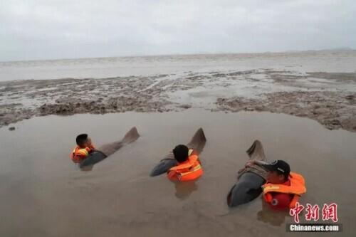 “看到它们在挣扎,我们很心疼,就像看一个小孩一样,心里想着一定要救它们。”王永标告诉记者,“当时气温很高,正逢退潮,到处都是泥,黏得很,人走进去都不好出来。”
