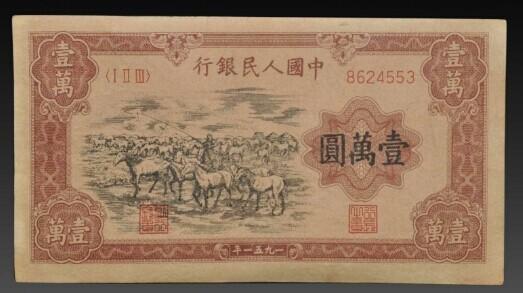 第一套人民币可重点关注10000元的“牧马图”和5000元的“蒙古包”。比如面值10000元的“牧马图”,全品相的市场价为380万元,在2012年3月上海泓盛的拍卖会上,一张九成新的10000元蒙文版“牧马图”,就拍出了299万元的高价。完整全套全球存量极少量,价值五六百万。这种罕见珍品别说全套了,你有其中几枚也不错的,对吧。