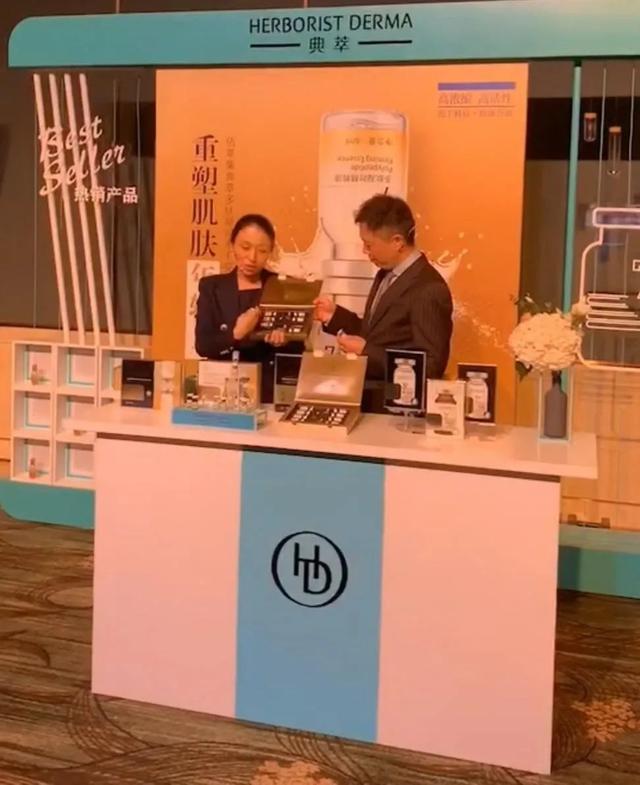 ▍上海家化董事长、首席执行官兼总经理潘秋生(右)在会场的典萃展台