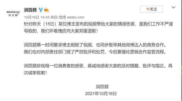 又一个因为代言人而营销翻车的品牌出现了。10月16日,“玻尿酸大王”华熙生物旗下品牌润百颜发表致歉声明,“针对昨天(15日)某位博主发布的视频带给大家的情感伤害,是我们工作不严谨导致的,我们怀着愧疚向大家郑重道歉!”