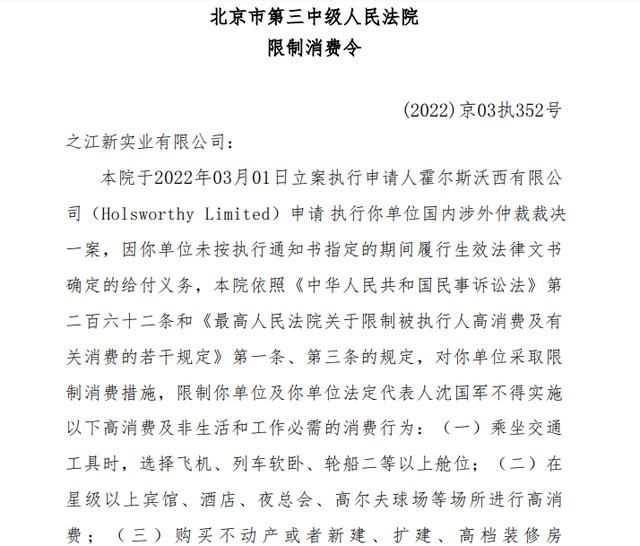 根据北京市第三中级人民法院的公告内容得知,沈国军参股的之江新实业因为与霍尔斯沃西有限公司存在着严重的经济纠纷,涉案金额超过6000万元,因拒不履行义务,导致被起诉。