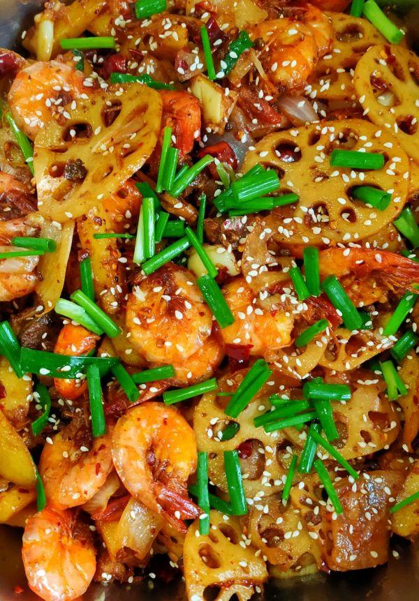 3、留底油 把火锅底料干辣椒段花椒姜 倒进去炒香 然后倒入大虾排骨藕片土豆条翻炒,放入洋葱,倒入耗油,适量盐,鸡精翻炒出锅 撒入芝麻葱花大功告成