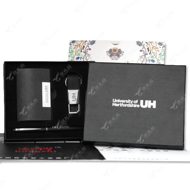 名片夹+签字笔+钥匙扣的三件组合装,采用优质皮质和合金材质,以及先进的印刷工艺打造的商务礼盒。黑色的产品配上优质的礼盒,适合作为商务礼品馈赠。