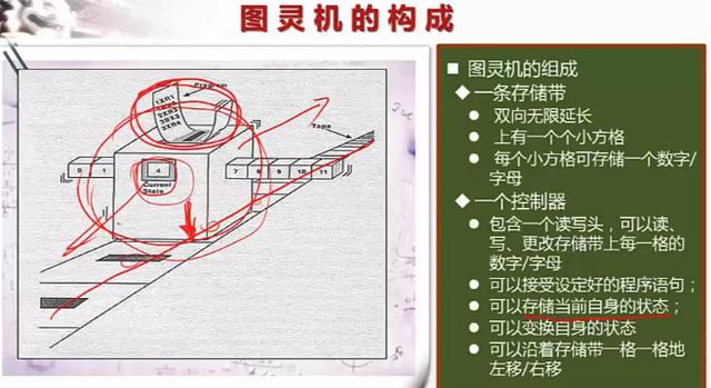 图灵机首先给出了一个可以实现的通用计算的一个模型。这就意味着,按照这个模型,我们有可能,制造出一台能够进行通用计算的机器。第二点,它引入了通过”读写符号“和”状态改变“来进行运算的这种思想。第三个,实现了基于简单字母表完成复杂运算的能力。它直接给你展现出来了,你看基于一个简单的字母表,或者只用1和空白,我们就实现了加法运算。第四个,引入了存储区、程序以及控制器等等概念的原型。