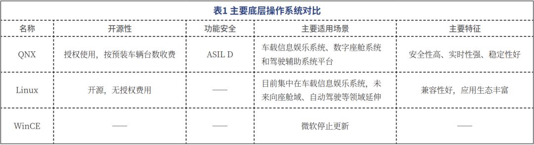 底层操作系统主要包括QNX、Linux、WinCE等(见表1)。QNX是遵从POSIX规范的类UNIX实时操作系统,是全球第一款达到ASIL D级别的车载操作系统,主要用于远程信息处理系统、信息娱乐和导航等,目前黑莓已开发了车载信息娱乐系统、数字座舱系统和驾驶辅助系统平台。Linux是定制开发灵活度较强、基于POSIX和UNIX的开源操作系统,主要用于支持更多应用和接口的信息娱乐系统场景。AGL、GENIVI等协会或联盟致力于将开源Linux操作系统推广至汽车领域。其中,AGL目前集中在车载信息娱乐系统,未来将向辅助驾驶、座舱域、自动驾驶等领域延伸;GENIVI致力于基于开源的标准车载信息娱乐平台,基本每半年对车载信息娱乐系统规范进行更新。WinCE是微软开发的嵌入式操作系统,主要应用于车载主机、车载导航和车载娱乐系统,已逐步退出汽车操作系统市场。目前,QNX凭借优势占据汽车嵌入式操作系统市场率第一,基于Linux内核的OS在智能座舱OS市场中占据约20%份额。