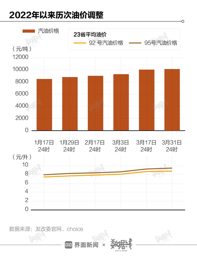 据发改委官网公开数据,3月17日油价调整后,国内每吨汽油价格已破万,达到1.0005万元/吨。3月31日上调后再次上涨110元,已达1.0115万元/吨。自1月17日以来,两个月增长1640元,涨幅达19.35%。
